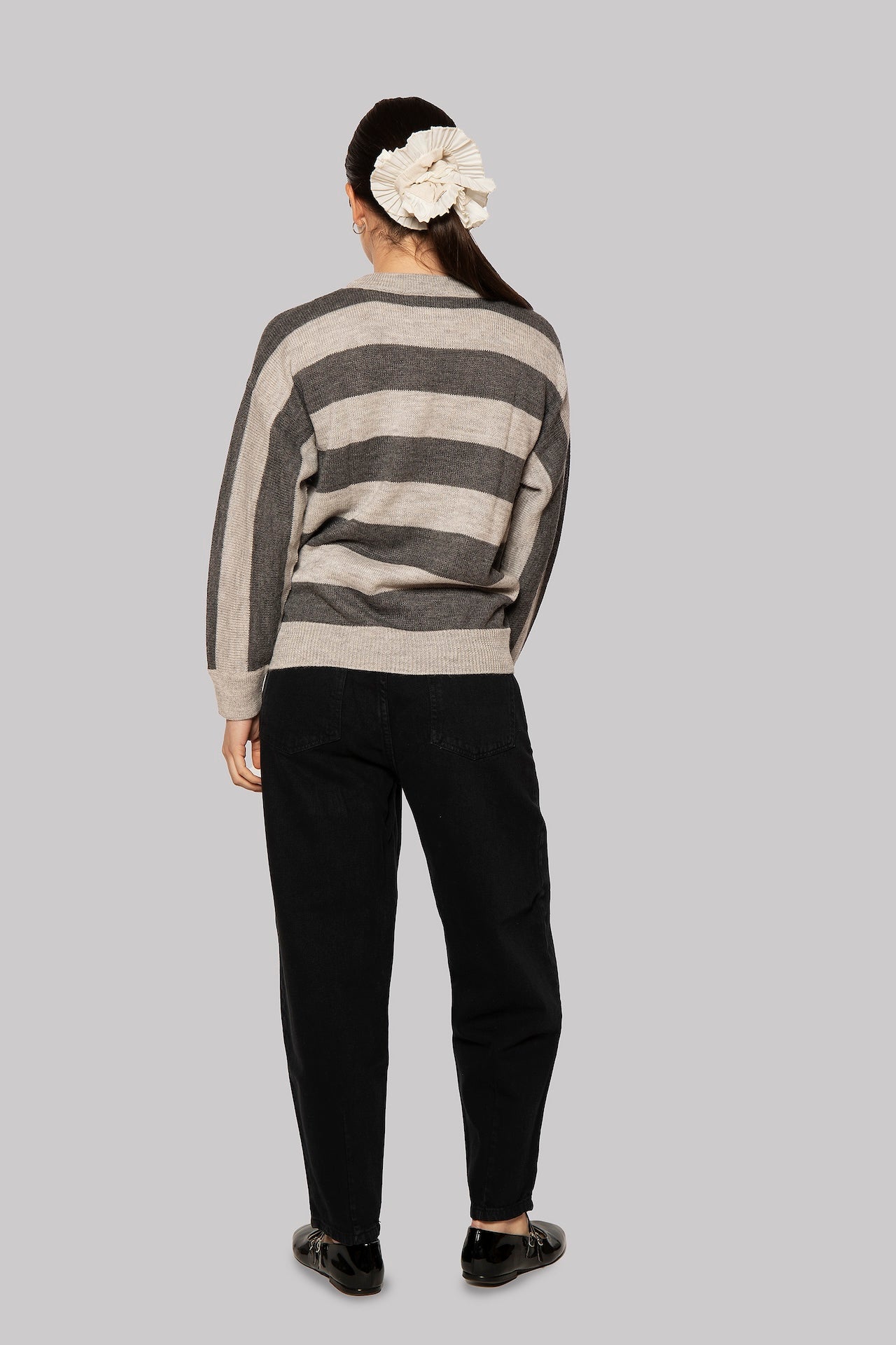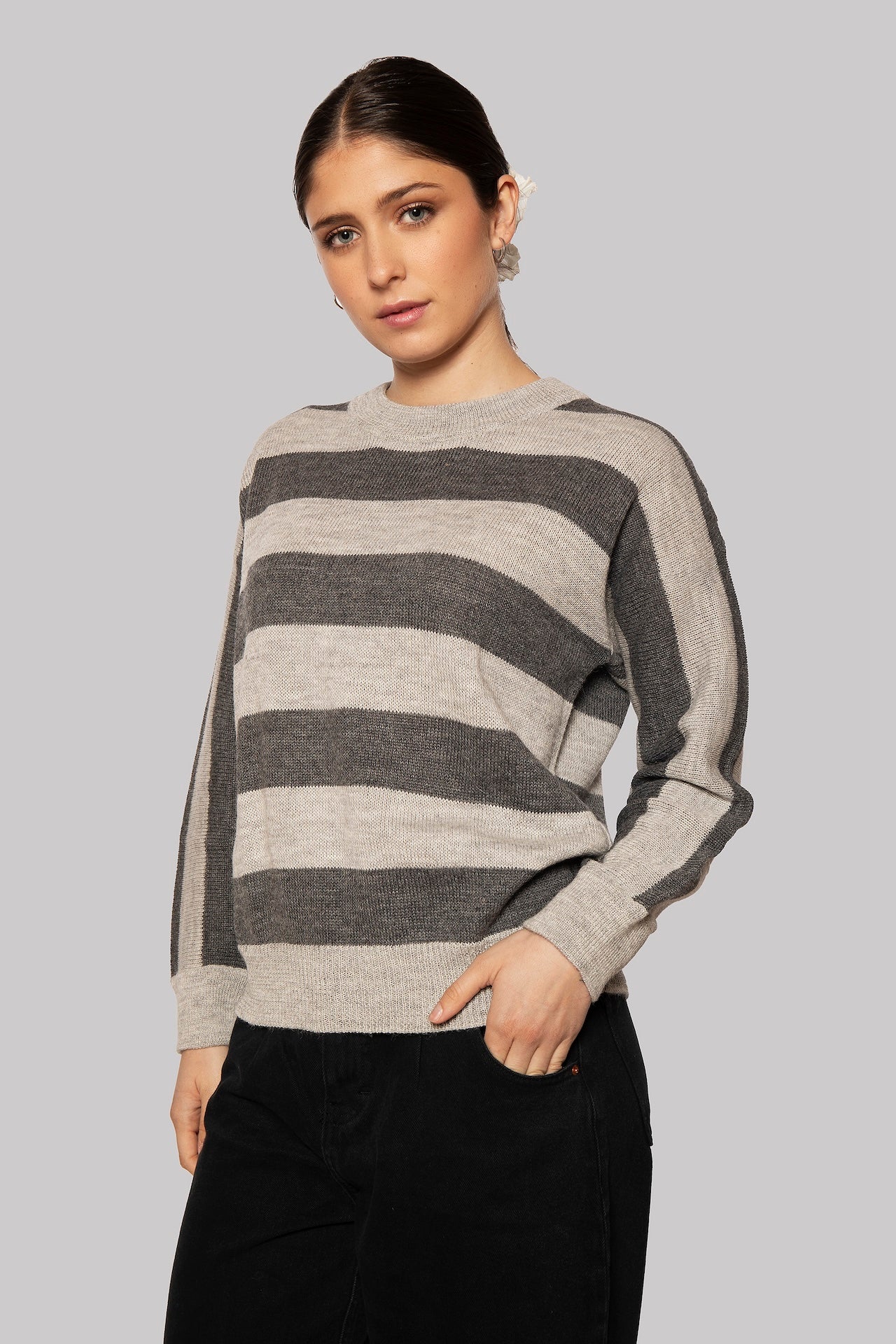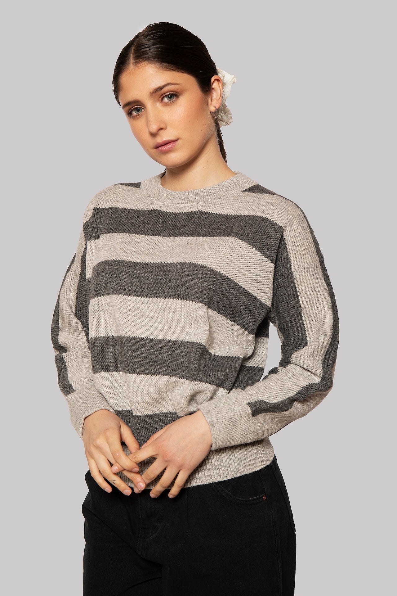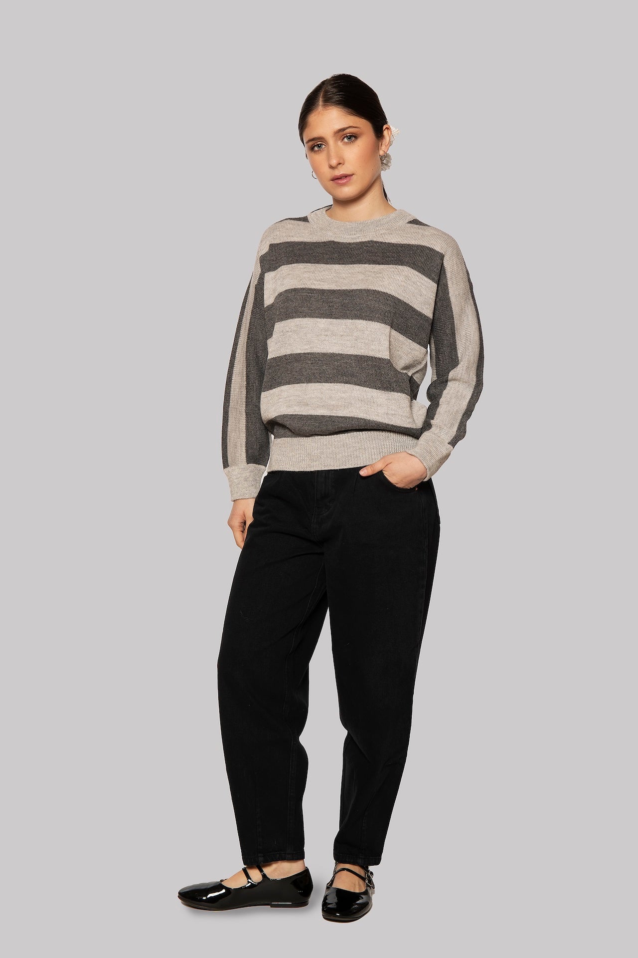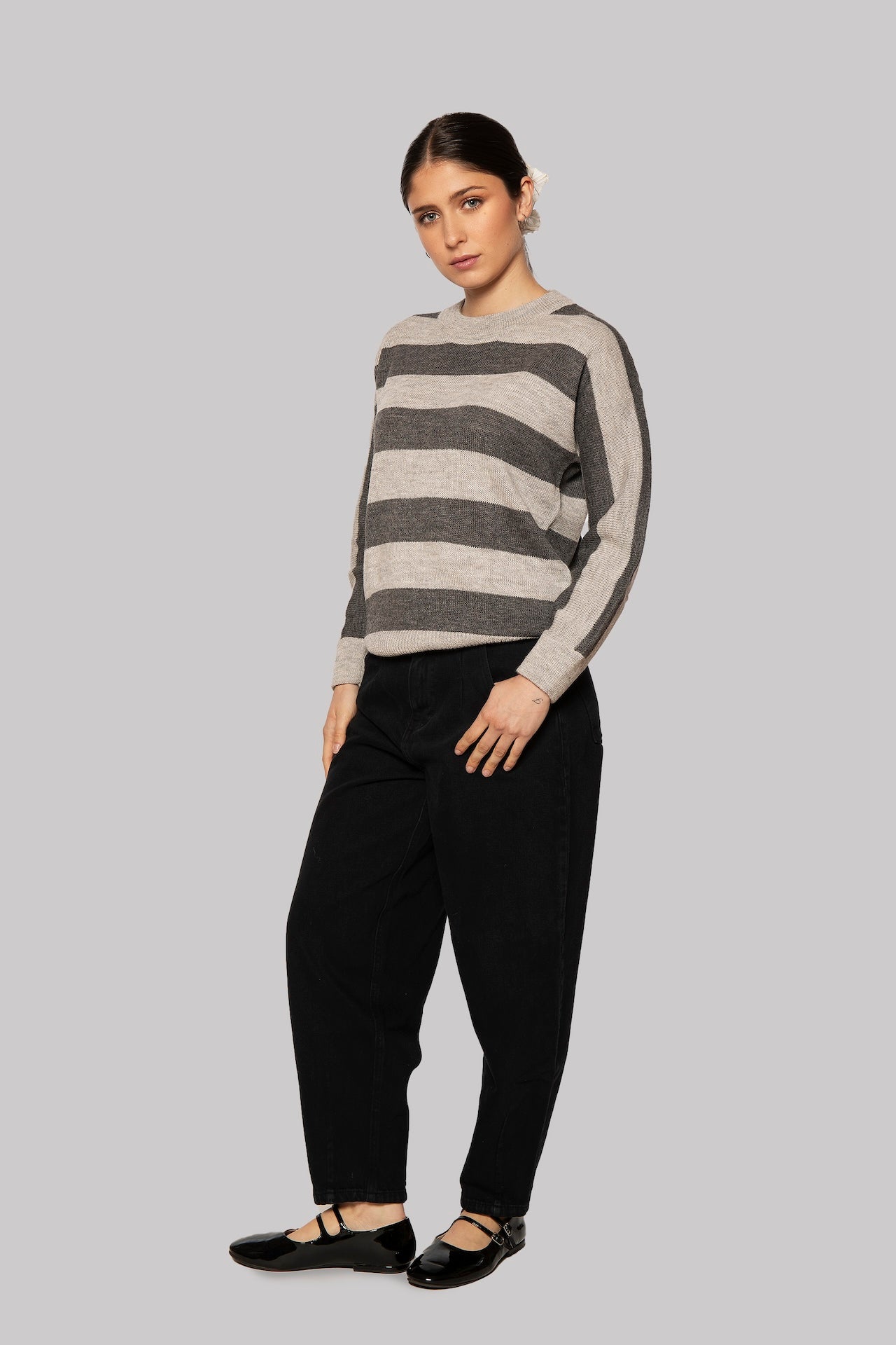 This Peruvian-knit alpaca blend sweater is a masterpiece of craftsmanship. Its striped design in shades of gray and charcoal adds a touch of sophistication to any look. The crew neckline and long sleeves make it a versatile and timeless piece. Perfect for the coldest days of fall and winter.